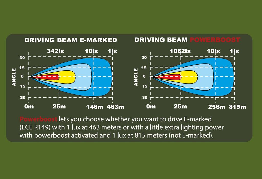 Alfa41+ Gen2 powerboost låter dig välja om du vill köra E-märkt (ECE R112) med 1 lux ljusstyrka vid 463 meter eller med extra kraft i ljuset med powerboost aktiverat och 1 lux vid 815 meter (ej E-märkt). Du aktiverar enkelt det E-märkta läget genom att koppla grön kabel på plus(+). När kabeln inte är kopplad så är powerboost-läget aktiverat.