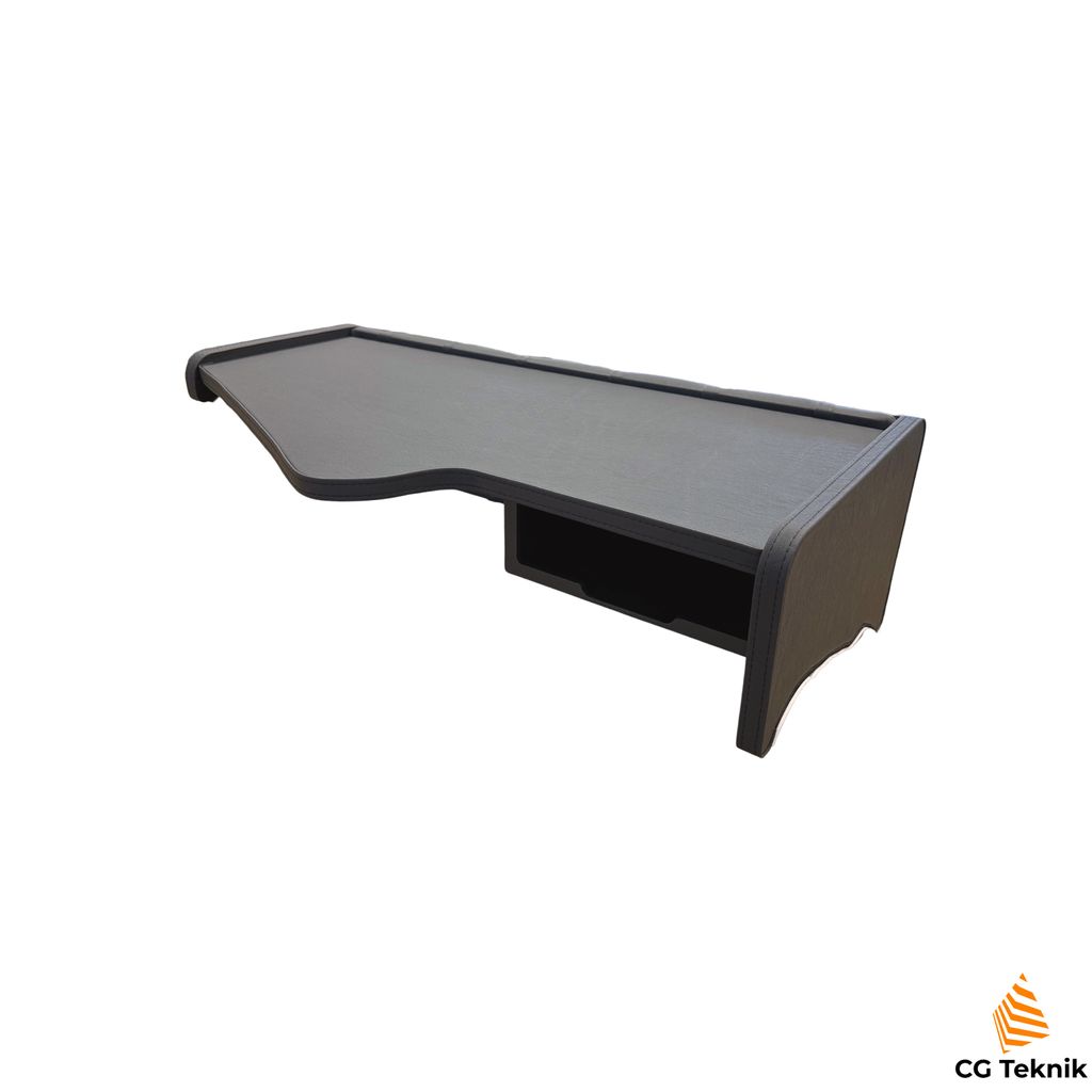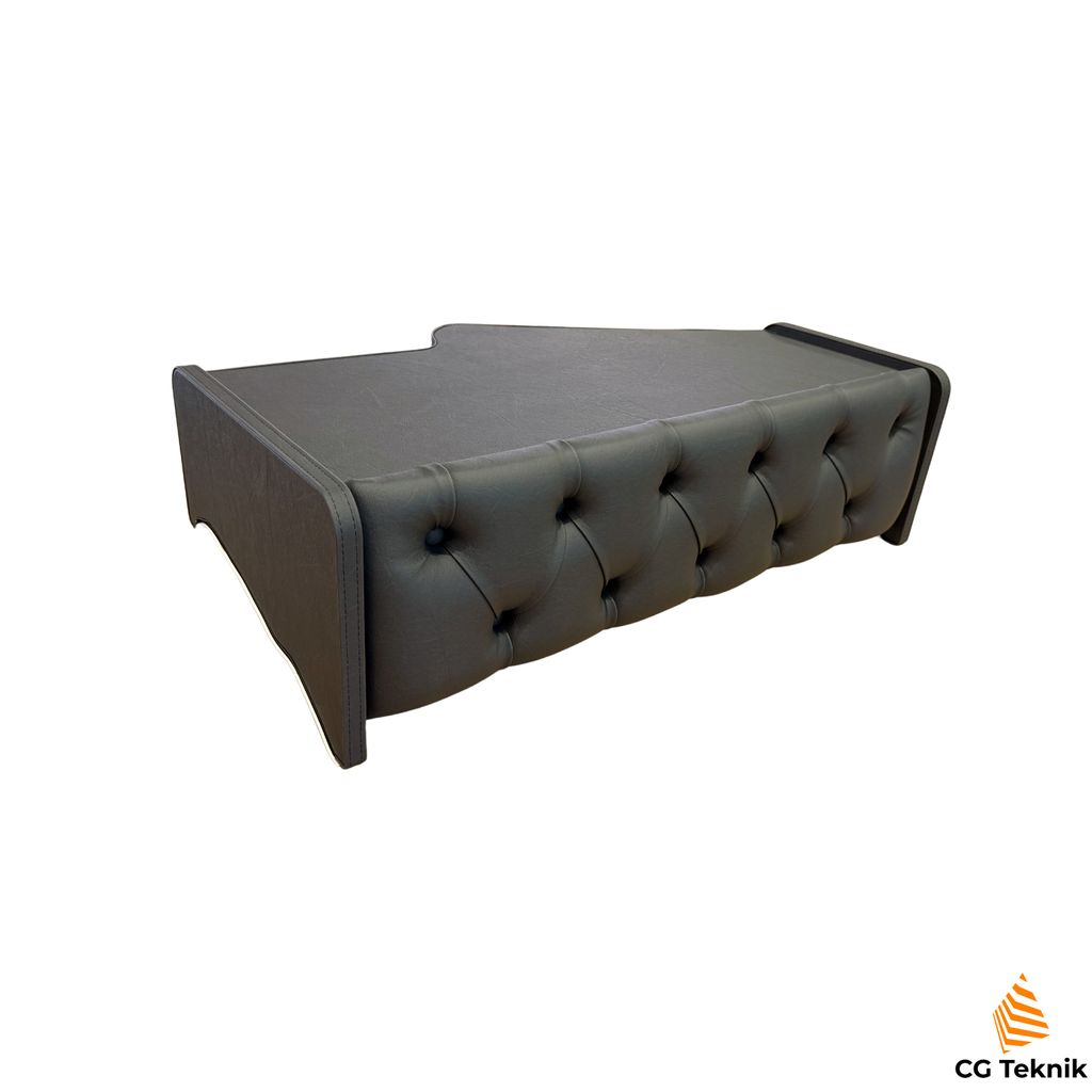 Detta lastbilsbord skiljer sig från många andra eftersom det sitter helt centrerat i hytten. Bordet är klätt i svart kvalitetskonstskinn och har en kantlist med dekorsöm. Under bordet finns även en hylla undertill för t.ex fraktsedlar.