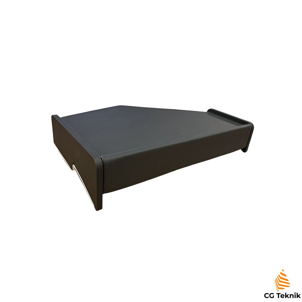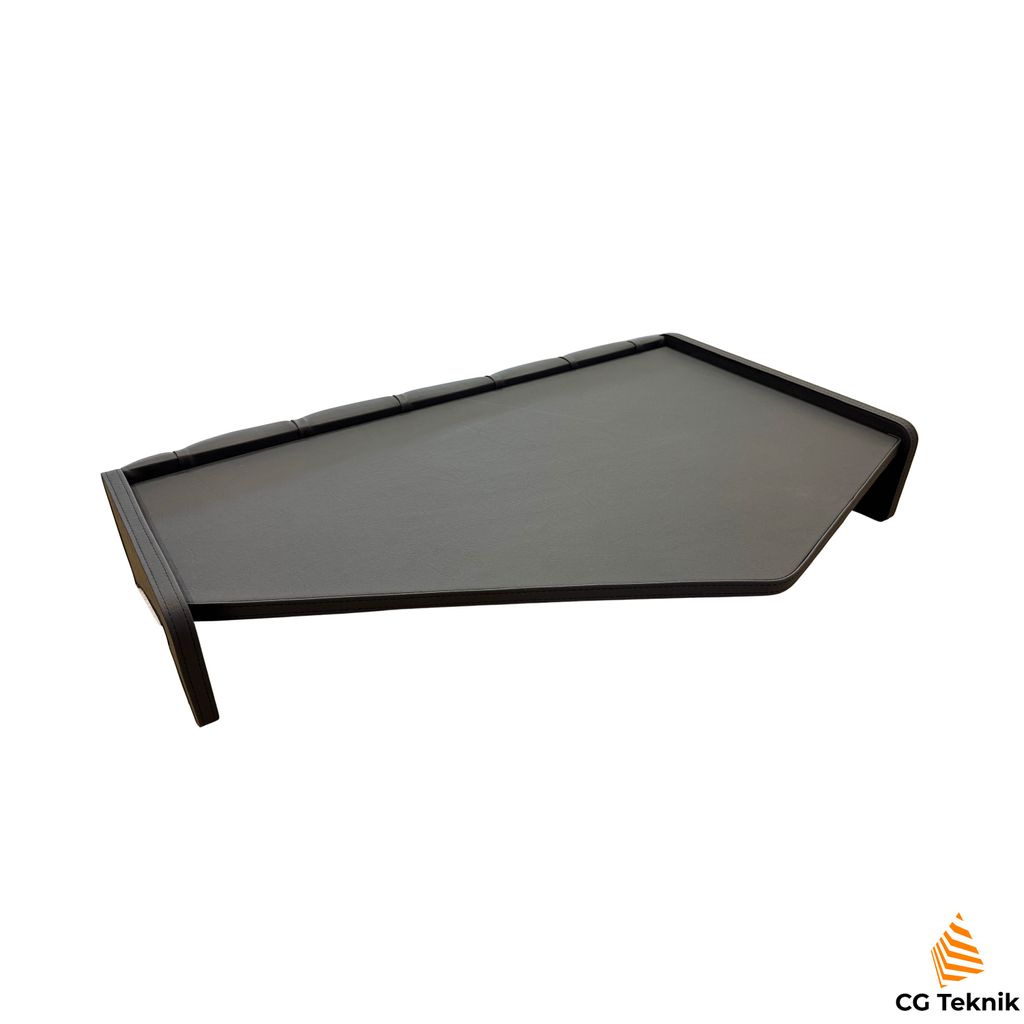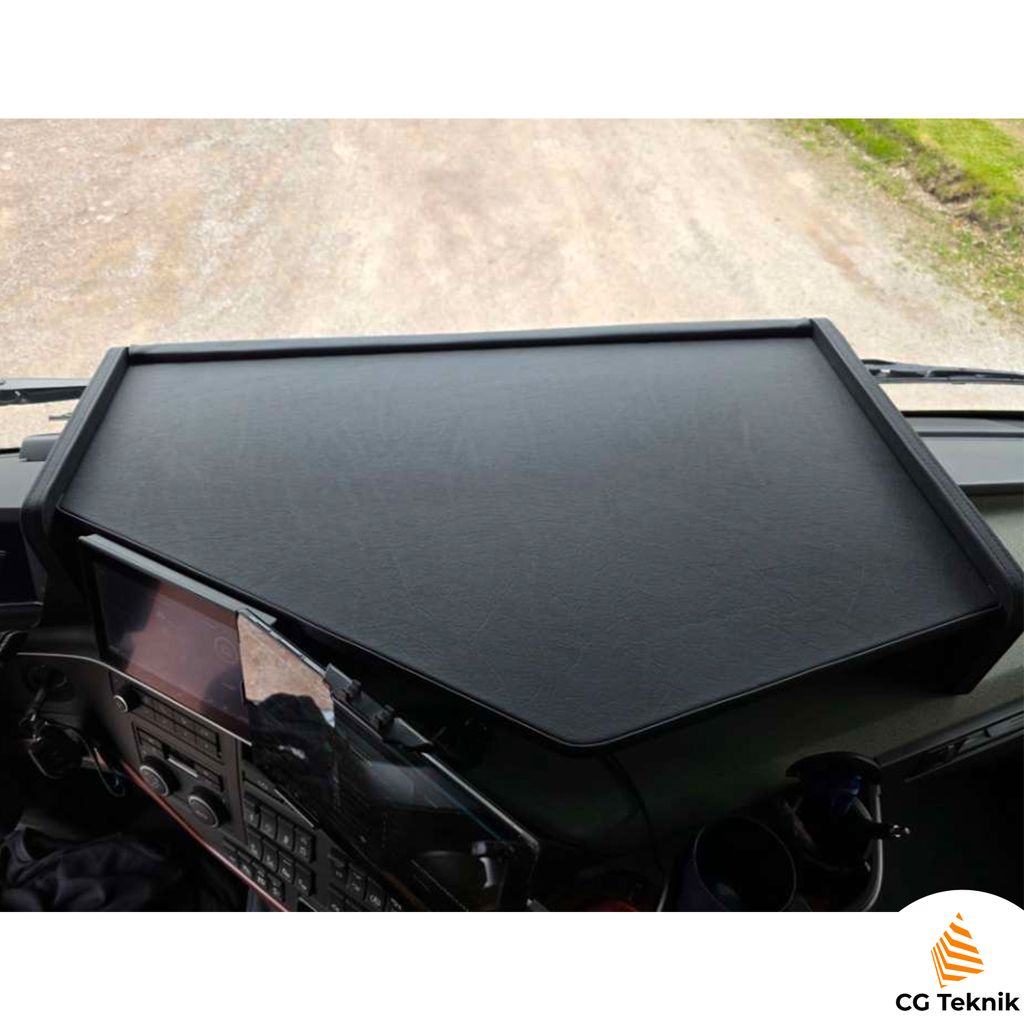 Detta lastbilsbord skiljer sig från många andra eftersom det sitter helt centrerat i hytten. Bordet är klätt i svart kvalitetskonstskinn och har en kantlist med dekorsöm.
