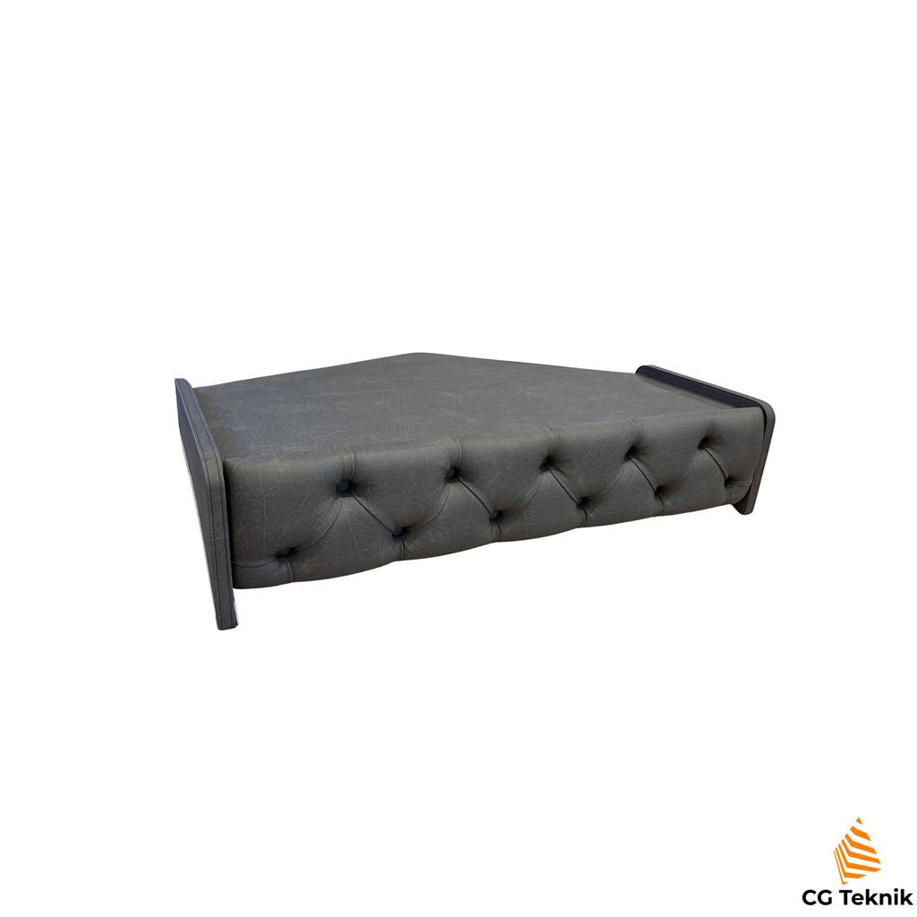 Detta lastbilsbord skiljer sig från många andra eftersom det sitter helt centrerat i hytten. Bordet är klätt i svart kvalitetskonstskinn och har en kantlist med dekorsöm.