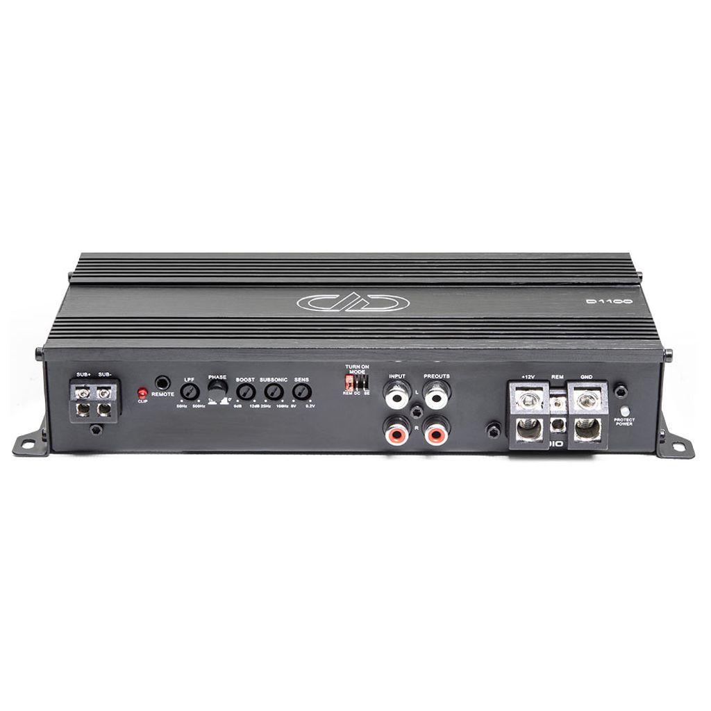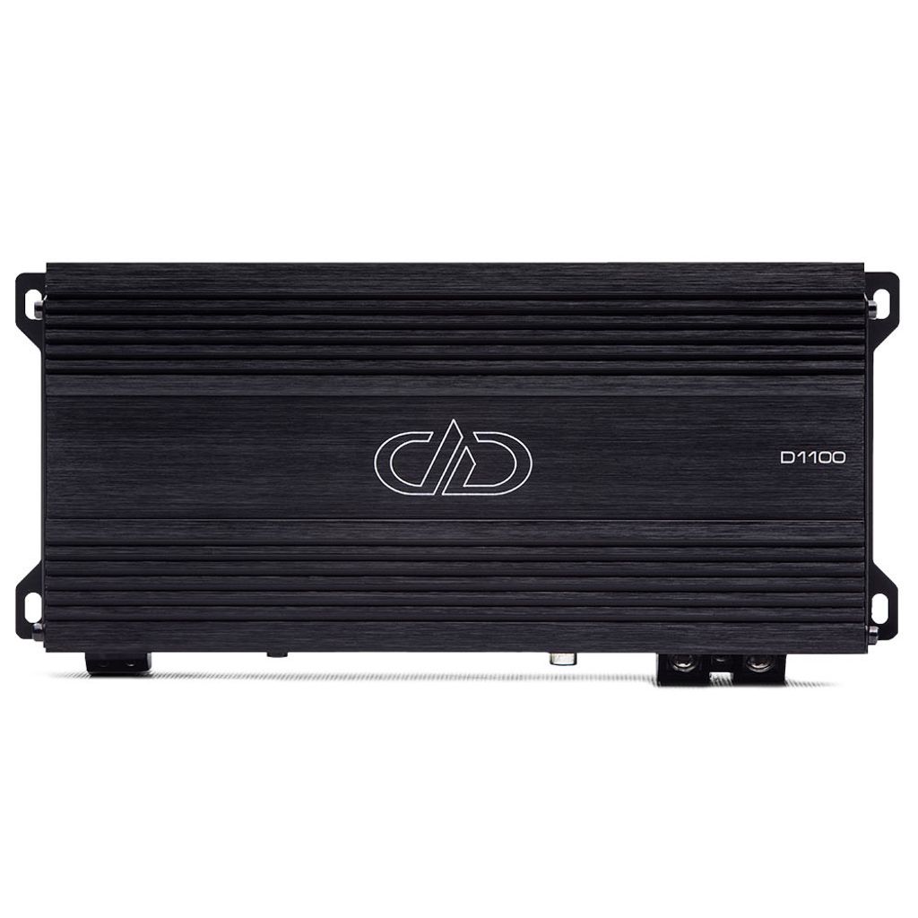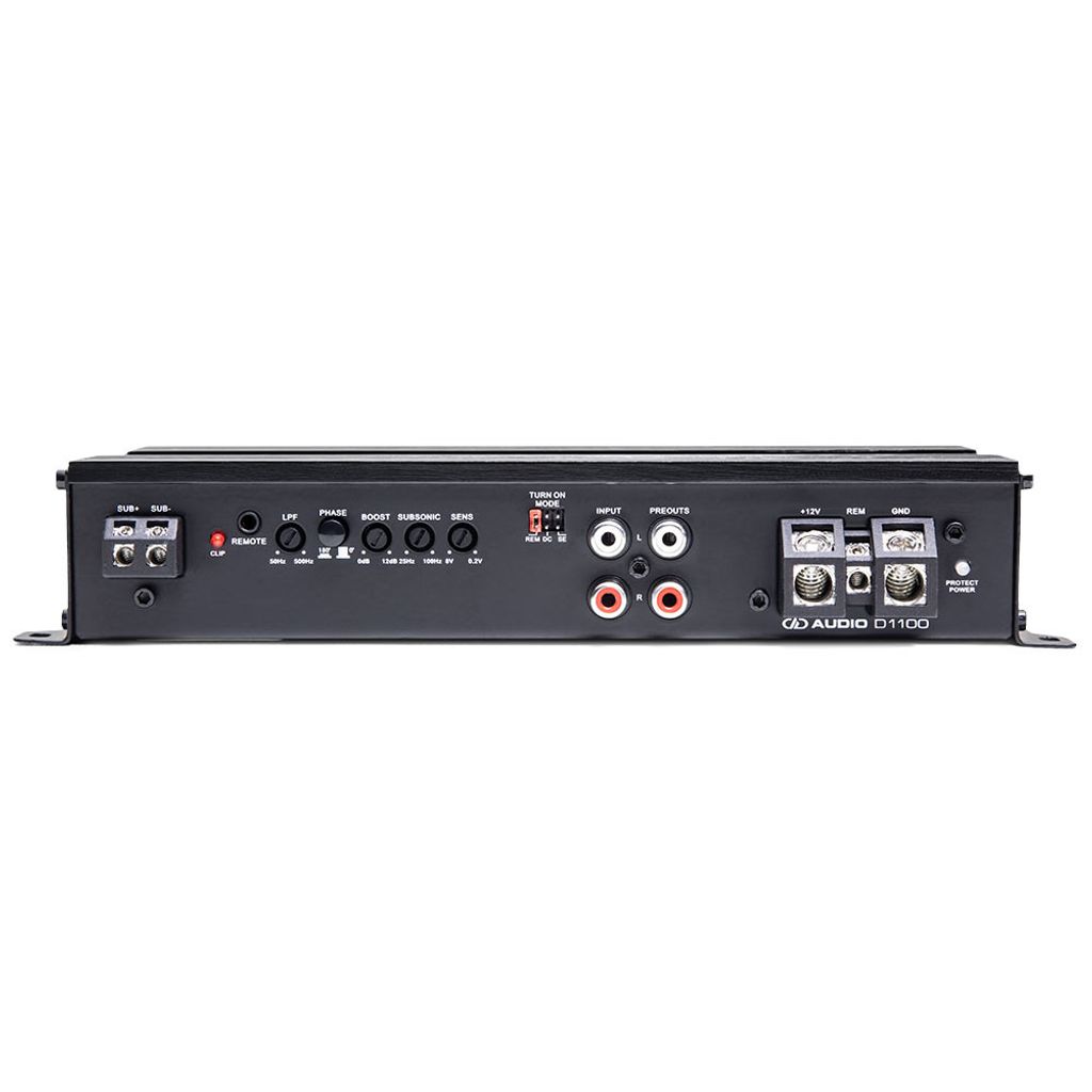 D‑seriens förstärkare är kompakta men har fullstora funktioner. D1100 är ett 1 Ω‑stabilt monoblock för subwoofer med totalt 1100 W uteffekt.