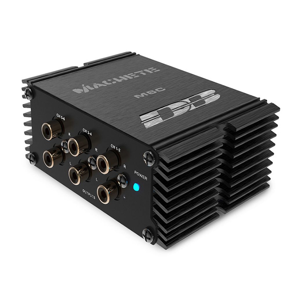 Beskrivning av DeafBonce Machete M6C 6 kanalig omvandlare med autostart och högeffekts ingång.Lågnivå utgång 6x5V