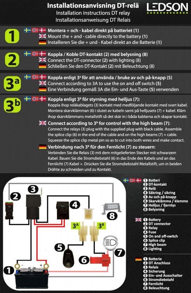 Relä med DT-kontakt och knapp för smidig inkoppling av extraljus eller LED-ramp. Ett extraljus eller en LED-ramp behöver bara en DT-kontakt. Två extraljus kräver två DT-kontakter, osv. Med 2-poliga kontakter dvs ej för belysning med positionsljus eller blixtljus.