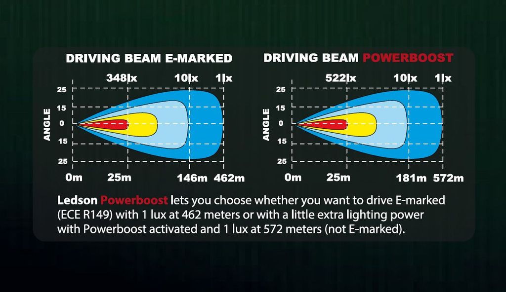- Range in powerboost mode: 572 m (1 lux)