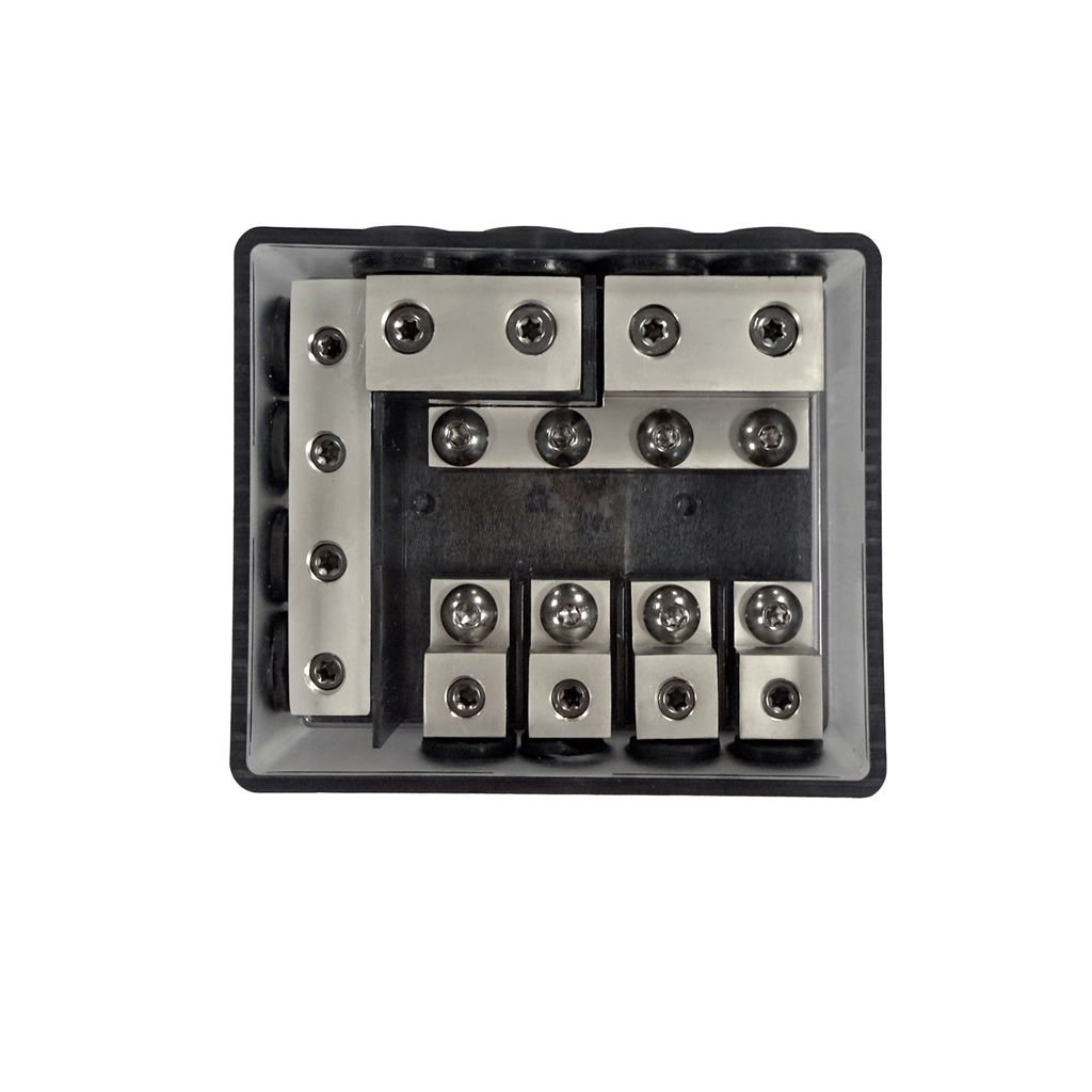 - Vattentät mini‑ANL‑säkringshållare av hög kvalitet med 4 platser för mini‑ANL‑säkringar (kombinerad strömdistribution + jordblock).