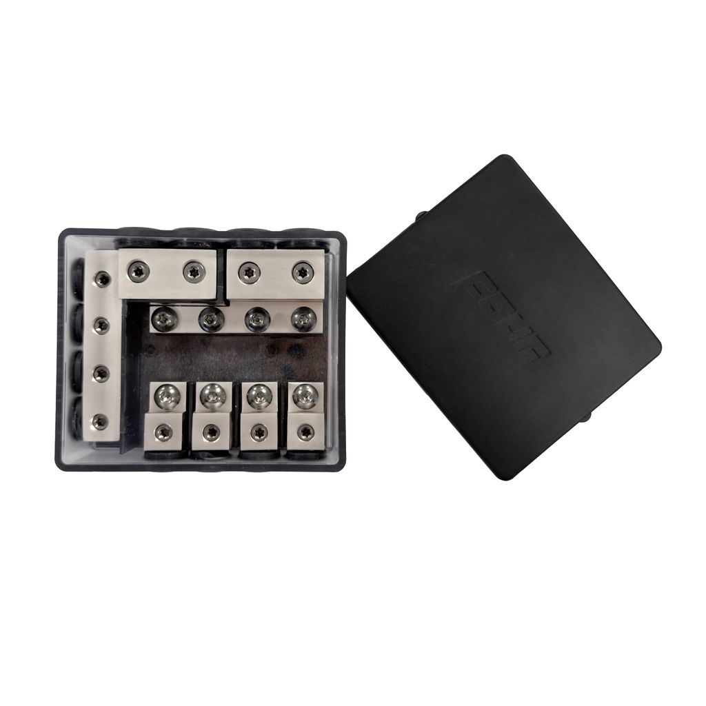 - Två 50 mm² ingångar passerar genom säkringar och kan distribueras till upp till fyra 20 mm² utgångar (positiva).