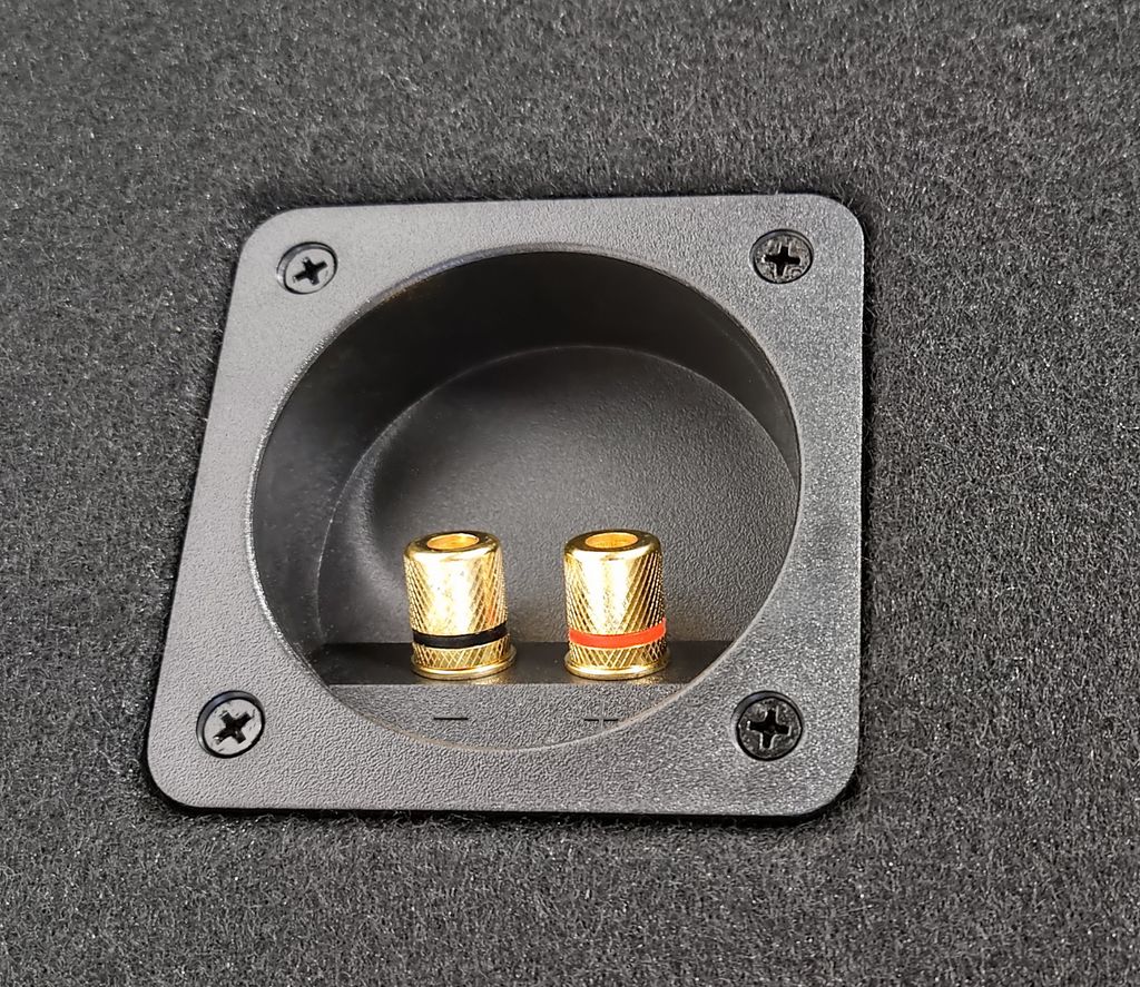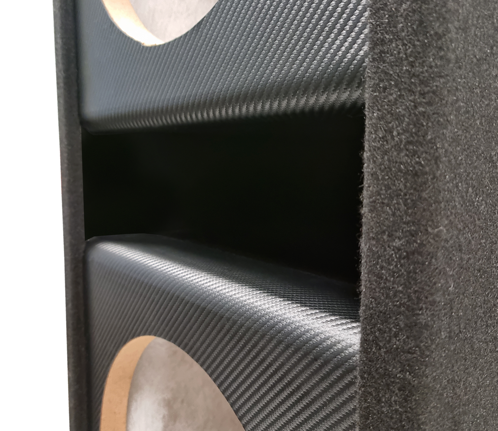 - Klädd i svart filt, frontpanel med kolfiberlook‑tejp