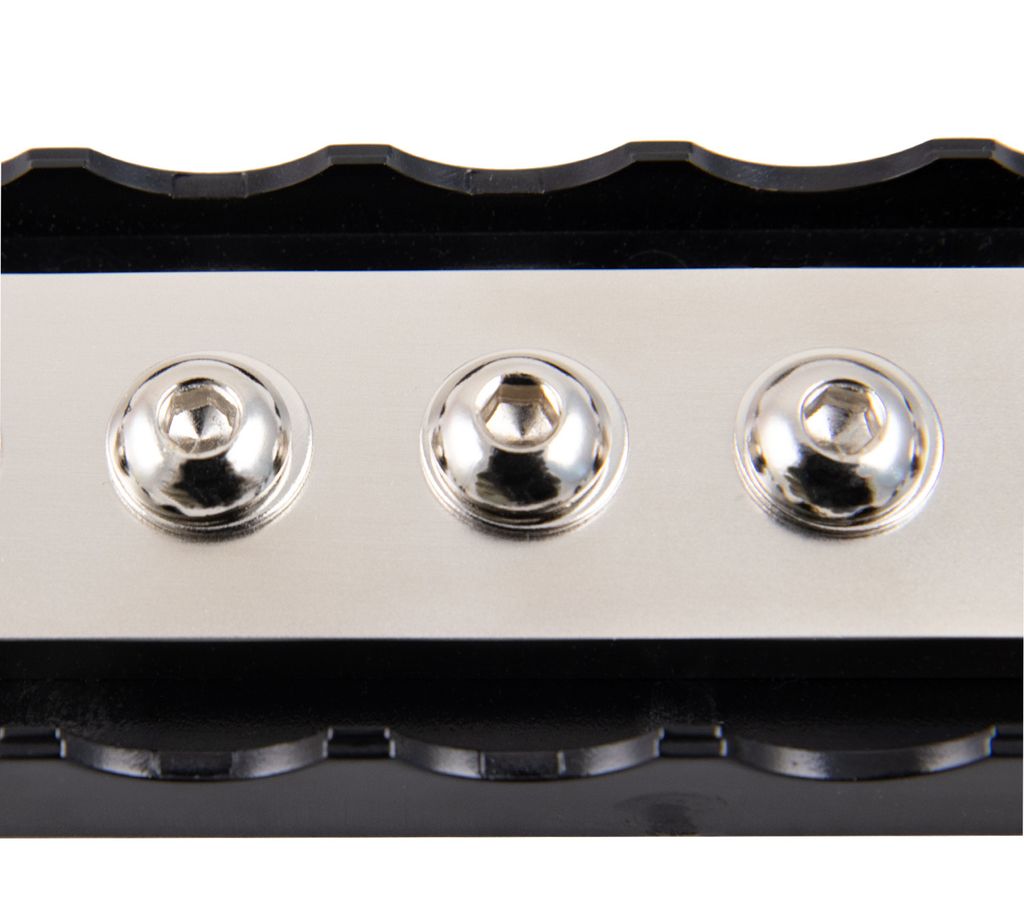 Robust strömfördelningslist med 8 st M8‑bultar för ringkabelskor. Öppet lock gör det möjligt att föra kablar in från båda sidor (samtidigt). Ändarna har monteringshål för säker fastsättning.