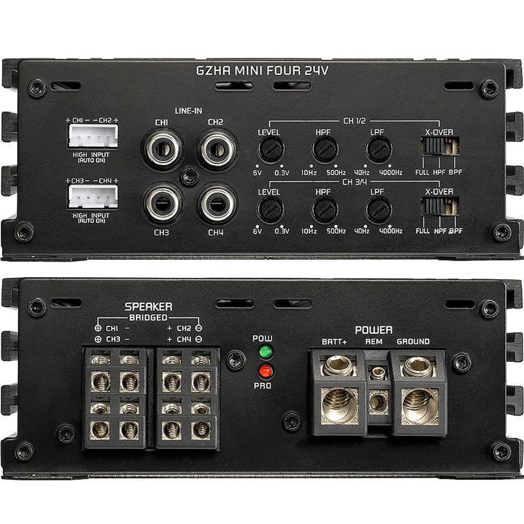 GZHA-miniförstärkare är den senaste D-klasstekniken som också används i OEM-förstärkare. Huvudskillnaden till traditionell D-klass är mycket bättre ljudkvalitet genom hela bandbredden. Det är omöjligt att säga i ett blindtest att du lyssnar på en bra AB-klassförstärkare eller GZHA-miniförstärkare. 24V-förstärkare är den bästa lösningen för lastbilar. Tack vare dubbel spänningen behövs bara hälften av strömmen. Du kan använda mindre ström- och jordkablar. Och du behöver inte spänningsregulatorer som tappar din ström.