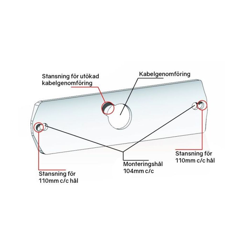 Hålavstånden mellan dem två skruvhålen är 104mm men kan utökas till 110mm genom att kapa bort försänkningen i anslutning till hålen. Detta då dem förborrade hålen passar Ledson 6-LED blixtljus och Nexus Böjbart LED Blixtljus men Blixtljus Superslim med 6 LED E-märkt har lite större hålavstånd så packningen behöver därmed anpassas till detta.