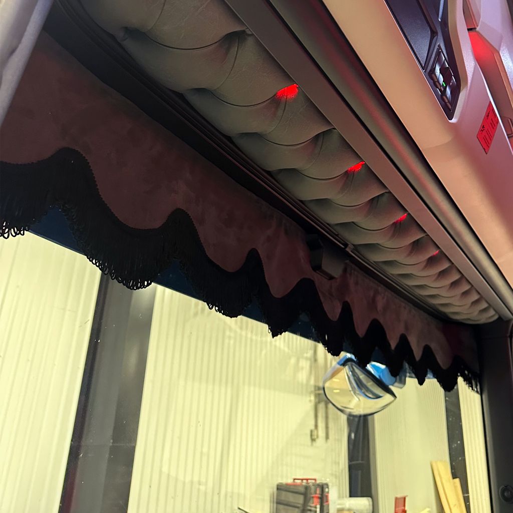 Dubbelsydd solskyddsgardin för lastbilsframruta i högkvalitativ mockaimitation — optimal hållbarhet och lyxig känsla. Levereras med självhäftande kardborreband för enkel montering i framrutan