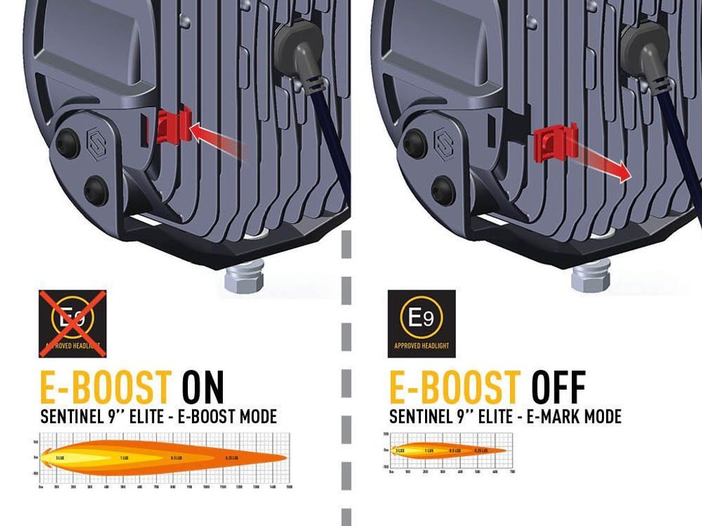 Sentinel Elite är E-godkänd R112, men detta gäller inte för E-Boost så för att den ska vara godkänd måste E-Boost tekniken kopplas ur så att ljusstyrkan minskar då till inom den tillåtna gränsen.