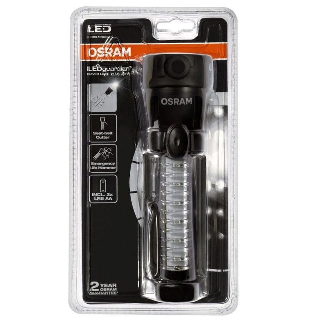 Ett måste i bilen för alla som tar säkerhet på allvar. Med Osrams säkerhetsficklampa kan du hjälpa dig själv och andra. Lampan består av tolv röda dioder i handtaket som blinkar som ett varningsljus samt en kraftig vit diod i fronten för att lysa upp där det behövs. Har också en kniv för att säkert kunna skära säkerhetsbälte för att snabbt kunna ta sig loss eller hjälpa andra personer loss. Lampan är så tålig att den även fungerar som glas-hammare så att du kan krossa rutan vid behov.