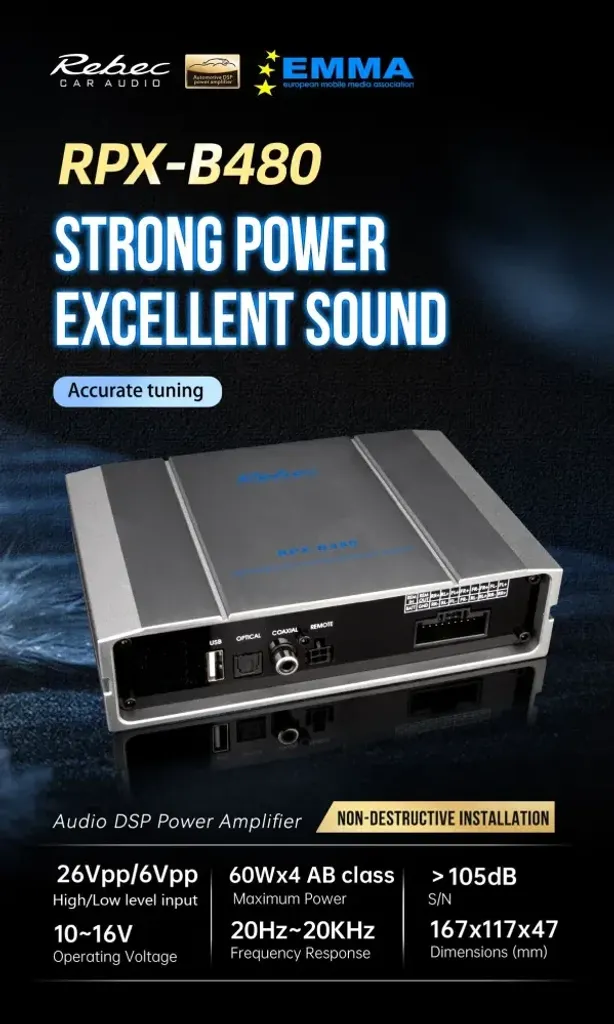 Rebec RPX-B480 är en 4-kanals förstärkare i klass AB som kombinerar kraft, klarhet och ljudkvalitet i ett kompakt format. Med sitt naturliga och dynamiska ljud lämpar den sig perfekt för SQL-byggen där både detaljrikedom och tryck prioriteras. Förstärkaren är konstruerad för att leverera stabil effekt vid 4 ohm och klarar höga insignalnivåer från både RCA och högnivåingångar, vilket gör den enkel att integrera i både original- och eftermarknadssystem.