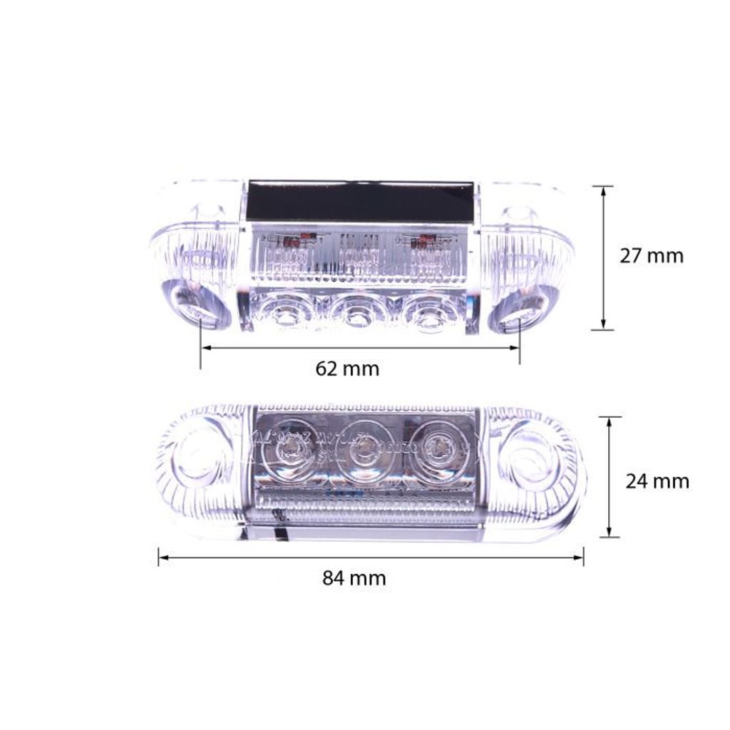 Beskrivning av Sidomarkering/pos.ljus LED. Transparant sidomarkeringslykta som är E-märkt. Mått: 84x24x25.Läs mer om E-märkningar här.Levereras styckvis.