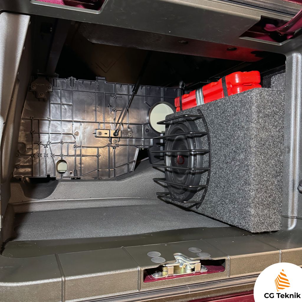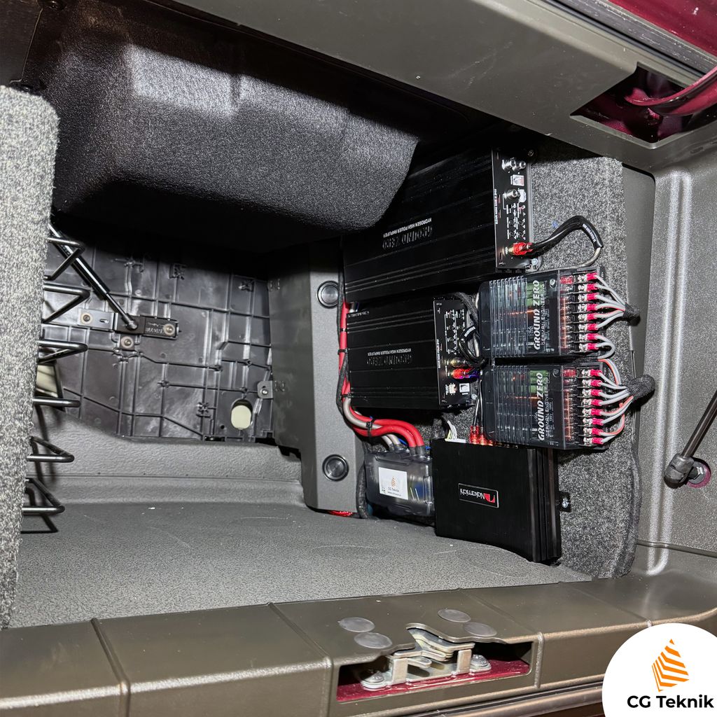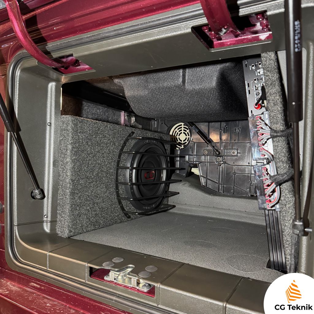 Steg 2 Monterat och Klart! — Ett kompakt ljudpaket med fylligt register och kraftfull bas. Vi monterar två slimmade 10" basar i varje fack så att paketet inte tar mycket plats och båda förvaringsfacken förblir användbara. Inkluderar noggrant utvalda komponenter och en ljudprocessor som sömlöst integreras med originalstereon för jämn, detaljerad ljudbild och full kontroll över alla frekvenser.
